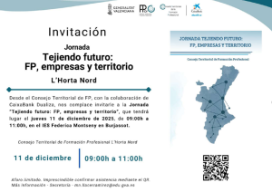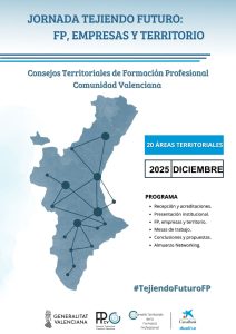 Los Consejos Territoriales de Formación Profesional han organizado, junto con la Dirección General de Formación Profesional y CaixaBank Dualiza, las jornadas Tejiendo futuro: FP, empresas y territorio, que se celebrarán del 2 al 19 de diciembre en las 20 áreas territoriales de la Comunitat Valenciana.