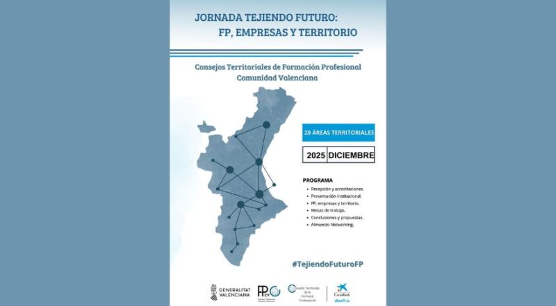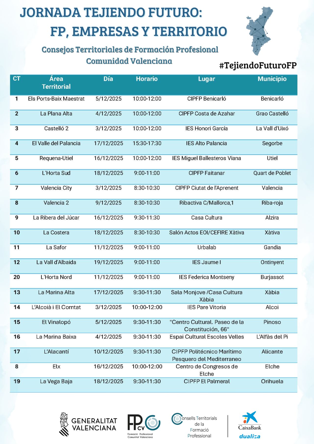 Los Consejos Territoriales de Formación Profesional han organizado, junto con la Dirección General de Formación Profesional y CaixaBank Dualiza, las jornadas Tejiendo futuro: FP, empresas y territorio, que se celebrarán del 2 al 19 de diciembre en las 20 áreas territoriales de la Comunitat Valenciana.